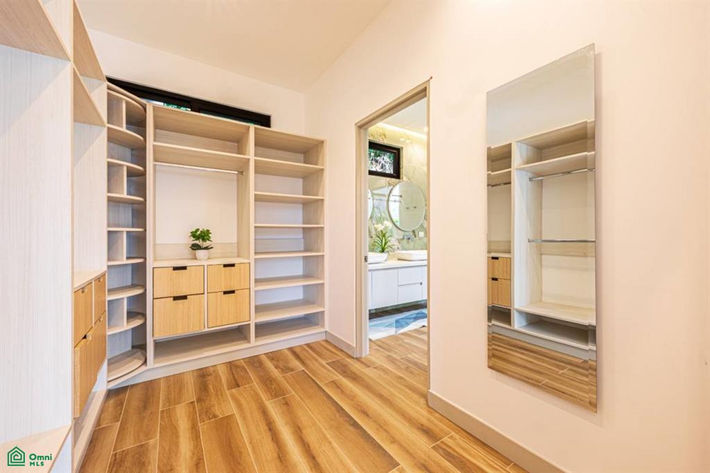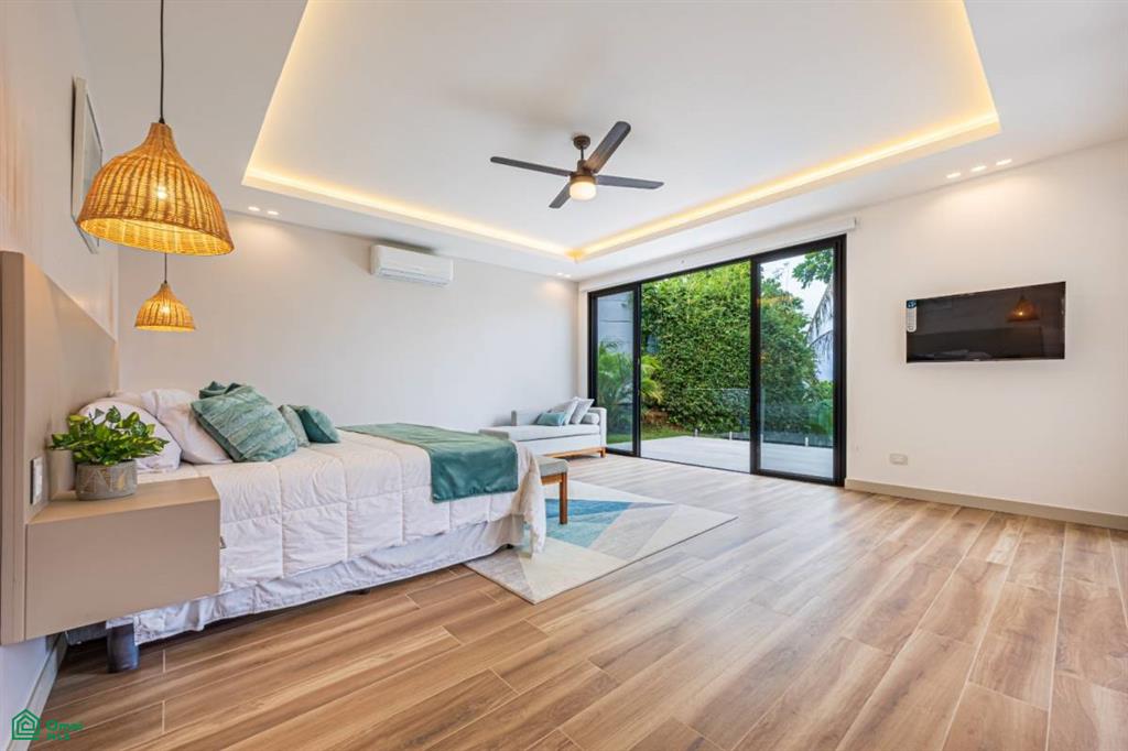 The south wing features a luxurious master suite with a king-size bed, walk-in closet with a built-in rotating shoe rack, and a spa-like en-suite bathroom adorned with onyx-green tiles and dual rainfall showerheads. In the north wing, two guest suites provide privacy and comfort, each with its own sleek en-suite bathroom, air conditioning, and a 43-inch TV. One of the bedrooms boasts a spectacular ocean view.
