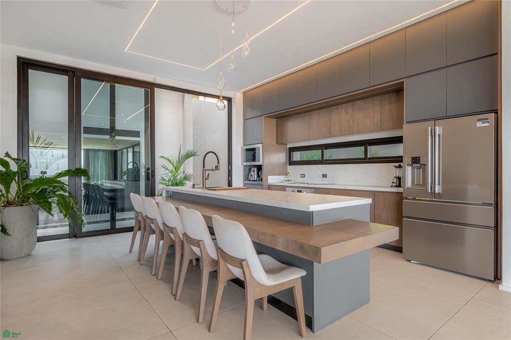 The residence features four bedrooms, four full bathrooms and two powder rooms, a beautifully appointed interior kitchen, and a stunning outdoor open kitchen, ideal for entertaining and embracing the tropical lifestyle. The spacious living area flows effortlessly toward the outdoor spaces, creating an atmosphere that is both warm and sophisticated. A private garage completes the property.