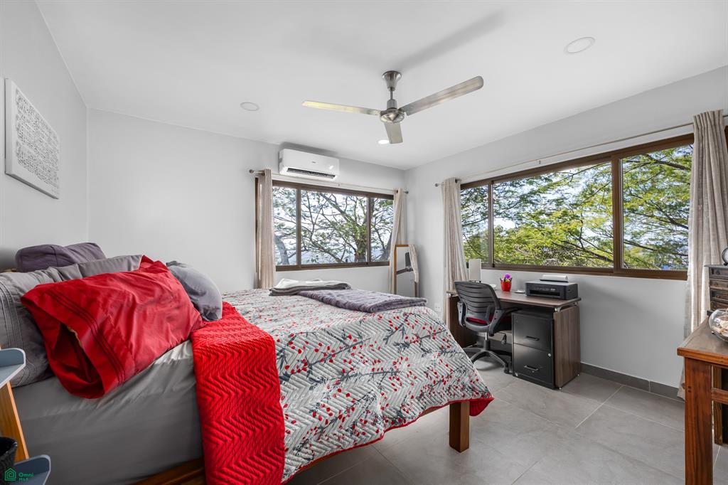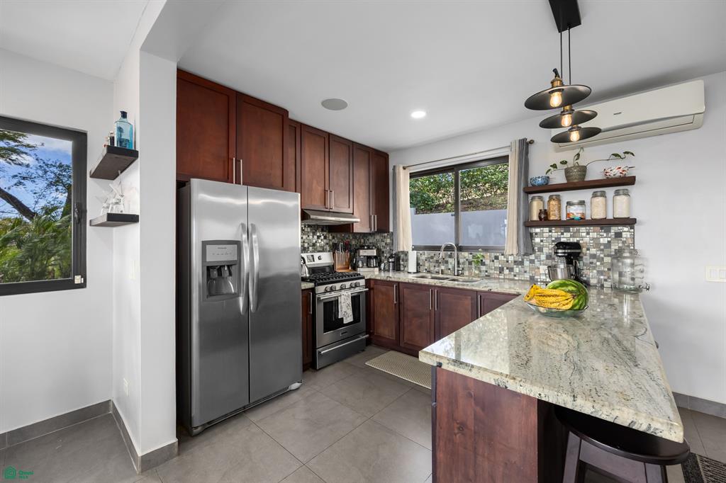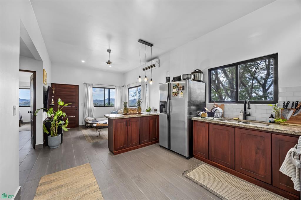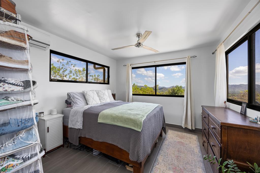 The main house is 1,400 sqft, and inside you’ll find a bright and welcoming living area with large windows and breathtaking views of the surrounding landscape. The open kitchen has ample countertop space and storage, making it perfect for preparing meals while enjoying the picturesque scenery. On the second floor there are 2 large bedrooms with an en-suite bathroom, a half bath, and a third-floor terrace offering stunning mountain views and a peek-a-boo ocean view.