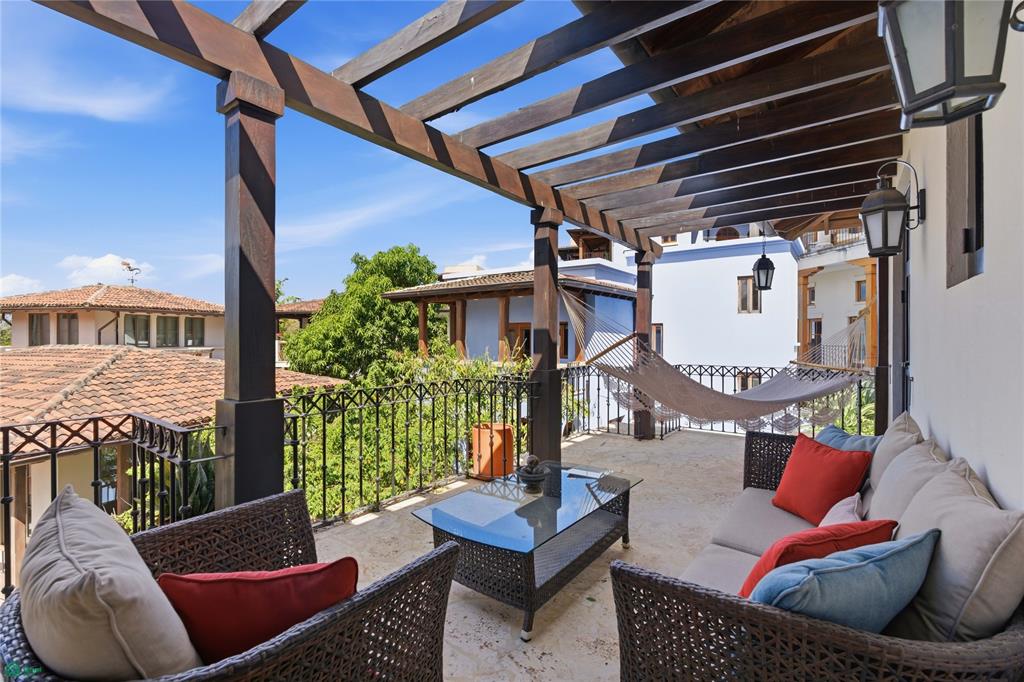 The upper level hosts the primary suite with a king bed, ensuite bath, and access to one of two sunset-facing terraces overlooking the charming surroundings of Plaza Escondida. An additional guest bedroom with ensuite bath is also located on this level, enjoying abundant natural light and refreshing cross-breezes.