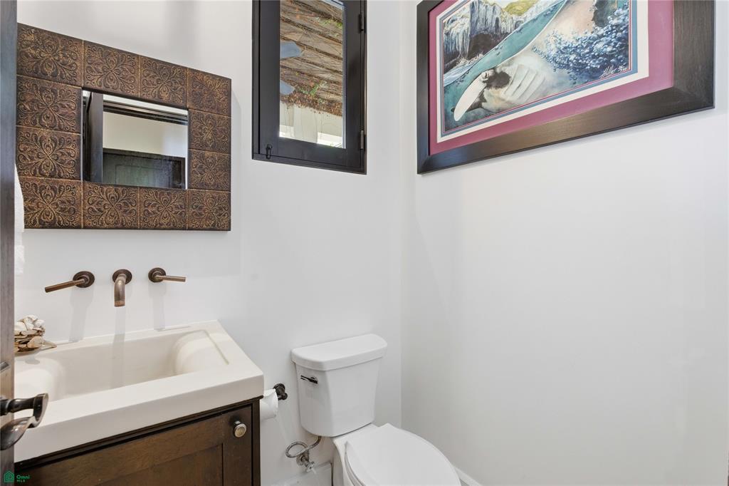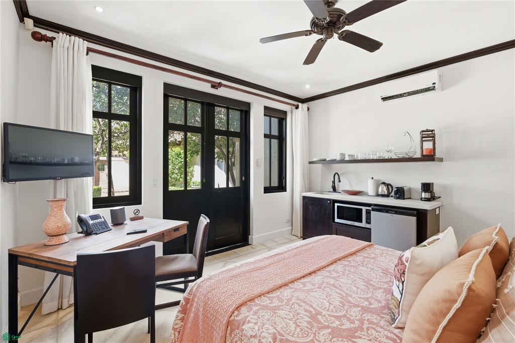 The lower level features a private walk-up studio with a queen bed and ensuite bathroom, accessed directly from Plaza Escondida. This flexible space is ideal for guests, extended family, or a private office.