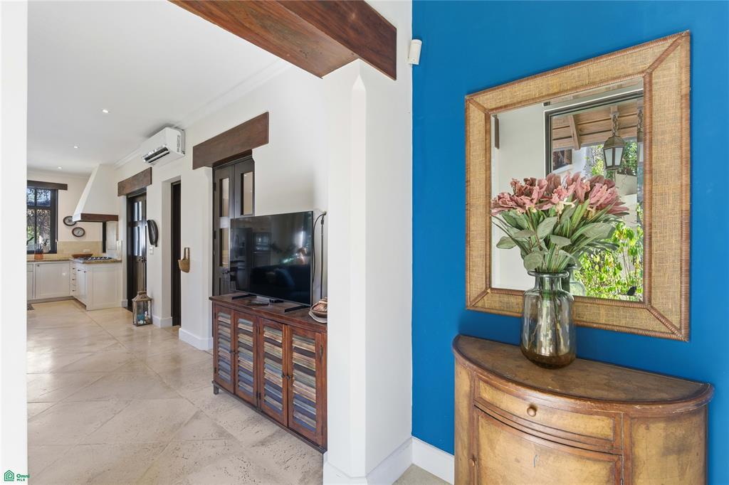 The main level opens into a bright and airy living and dining area finished in warm earth tones. Large glass doors from both the living room and kitchen open directly onto the pool terrace, creating a seamless indoor-outdoor living experience. This level also includes a guest bedroom with ensuite bath, a convenient half bath, and an additional bedroom positioned across the terrace for added privacy and separation from the main living area.