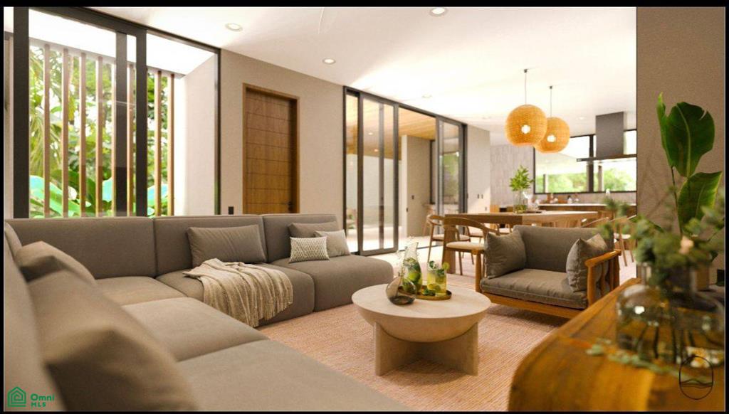 The open-concept living, dining, and kitchen areas flow seamlessly onto a spacious outdoor terrace with pool, BBQ area, and lounge spaces, perfect for entertaining or relaxing after a day at the beach. Clean architectural lines, natural materials, and a functional layout create a timeless yet contemporary aesthetic.