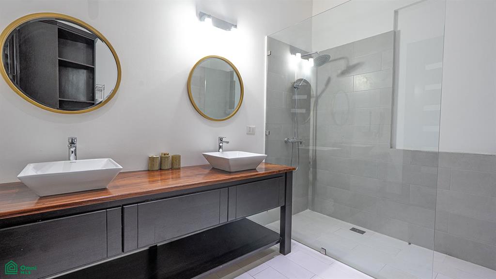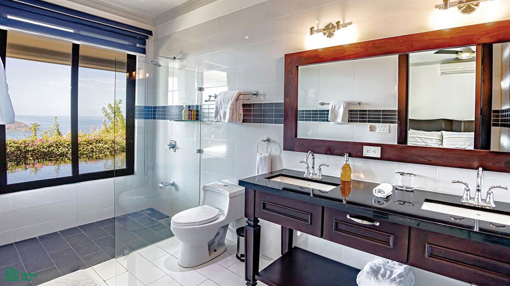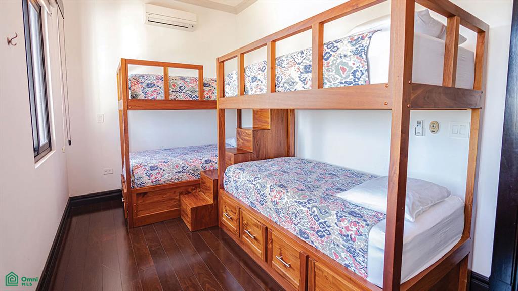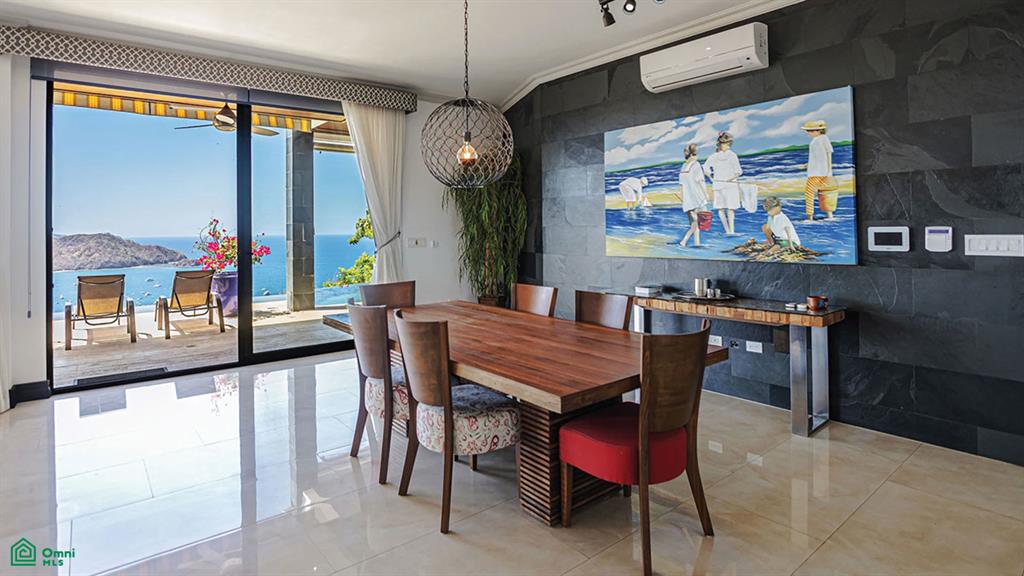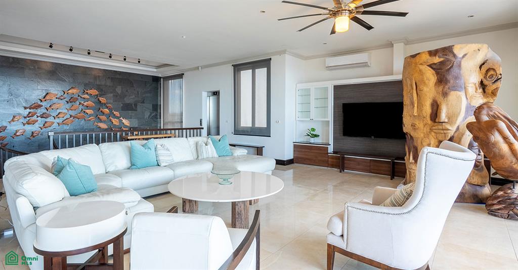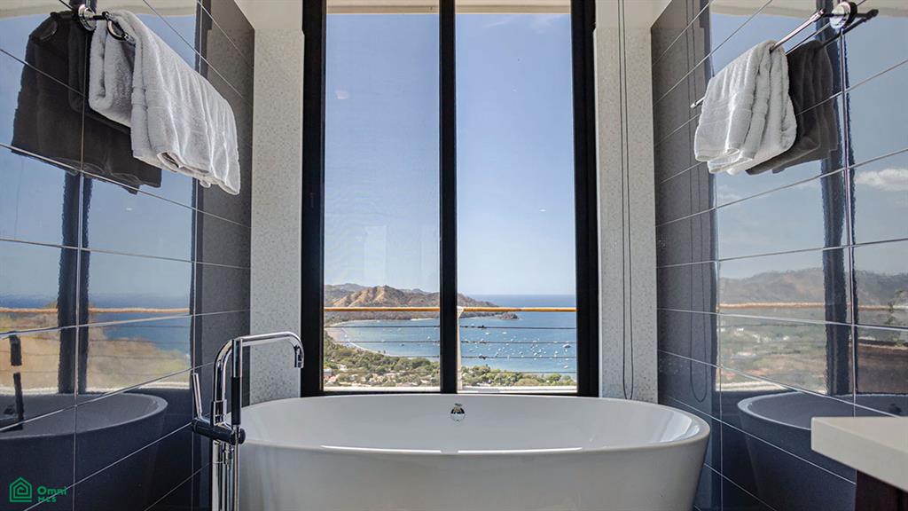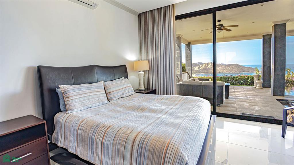 Designed for privacy, panoramic views, the residence showcases curated Costa Rican artwork, custom finishes, and an effortless flow. The upper level is dedicated to the primary suite and private living spaces. Double doors open to a balcony overlooking the coastline, while the spa-style ensuite includes a soaking tub and dual shower, creating a true retreat. Additional bedrooms and a private lounge on this level offer comfort for family or guests.
