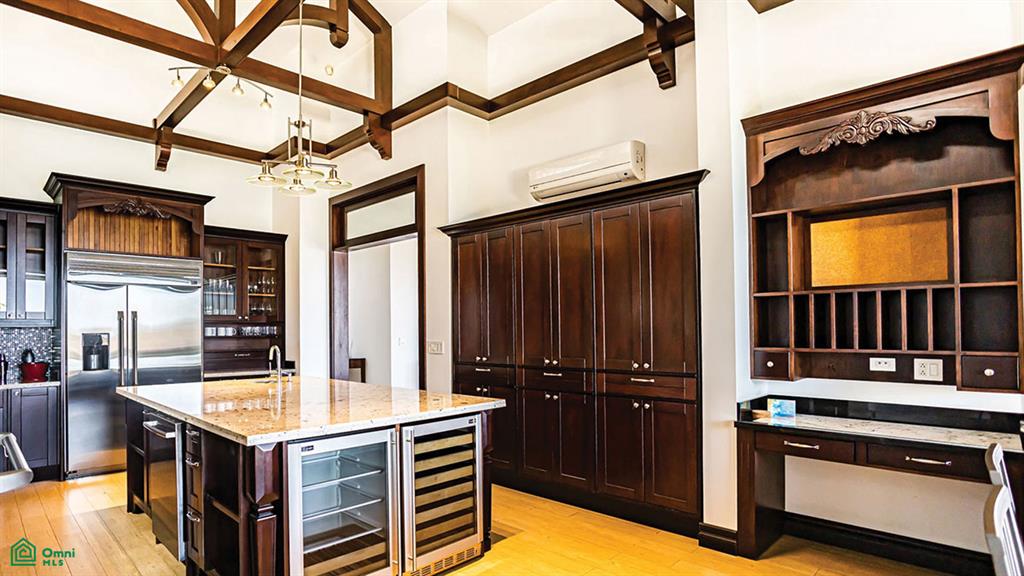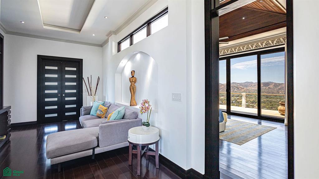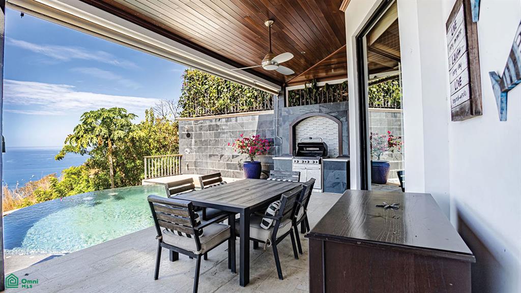 The main living level is ideal for indoor-outdoor living and entertaining. A spacious terrace features a custom outdoor kitchen with BBQ, multiple seating areas, and an infinity-edge pool with a sun shelf — perfect for relaxing while enjoying Pacific views. Inside, high ceilings frame open living and dining areas. The kitchen is both visually striking and highly functional. All furnishings, décor, and artwork are included, making the home fully turnkey.