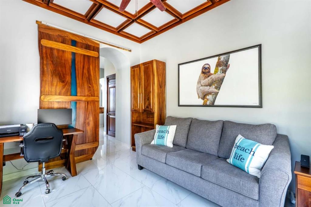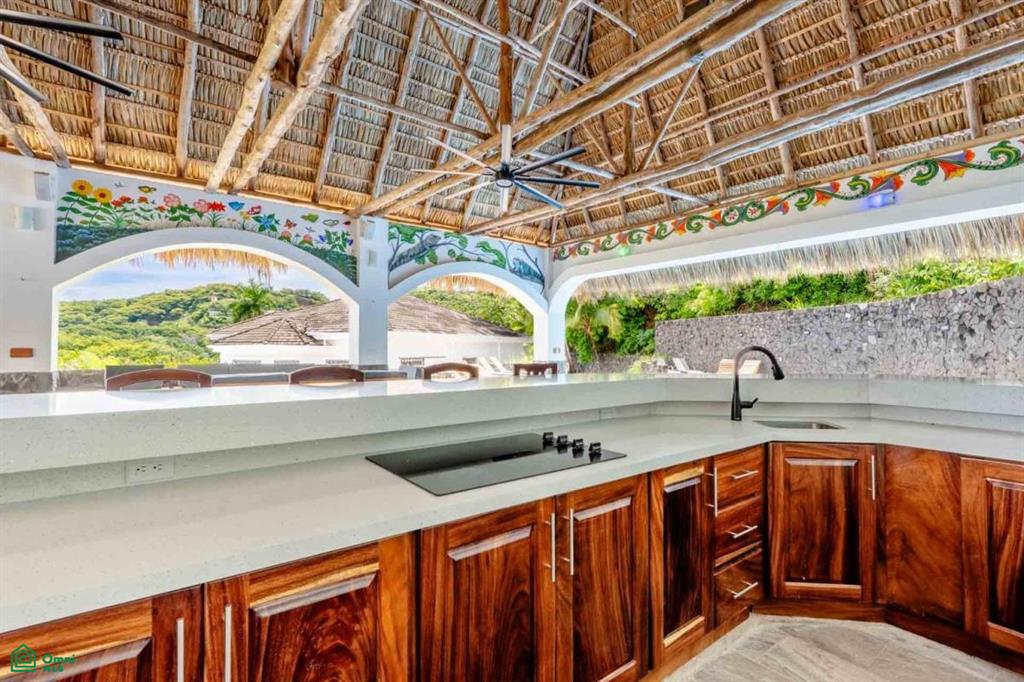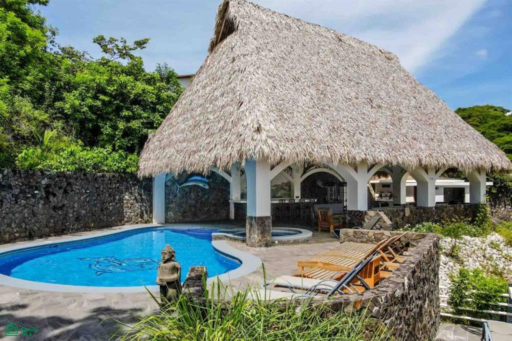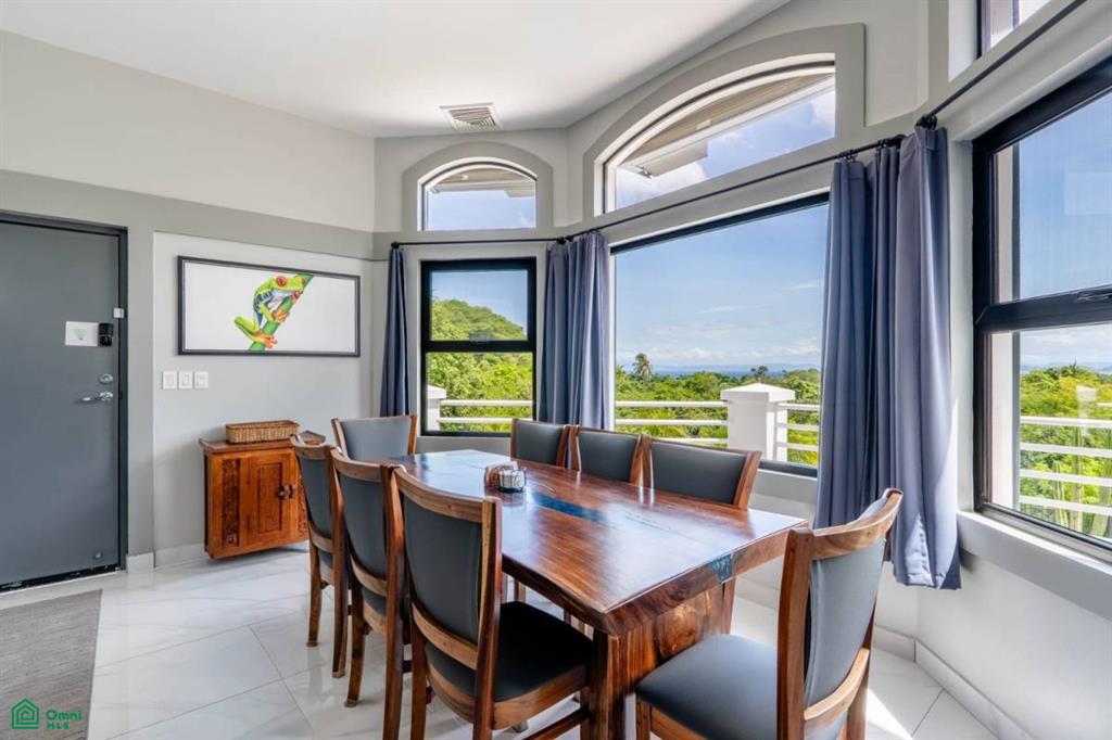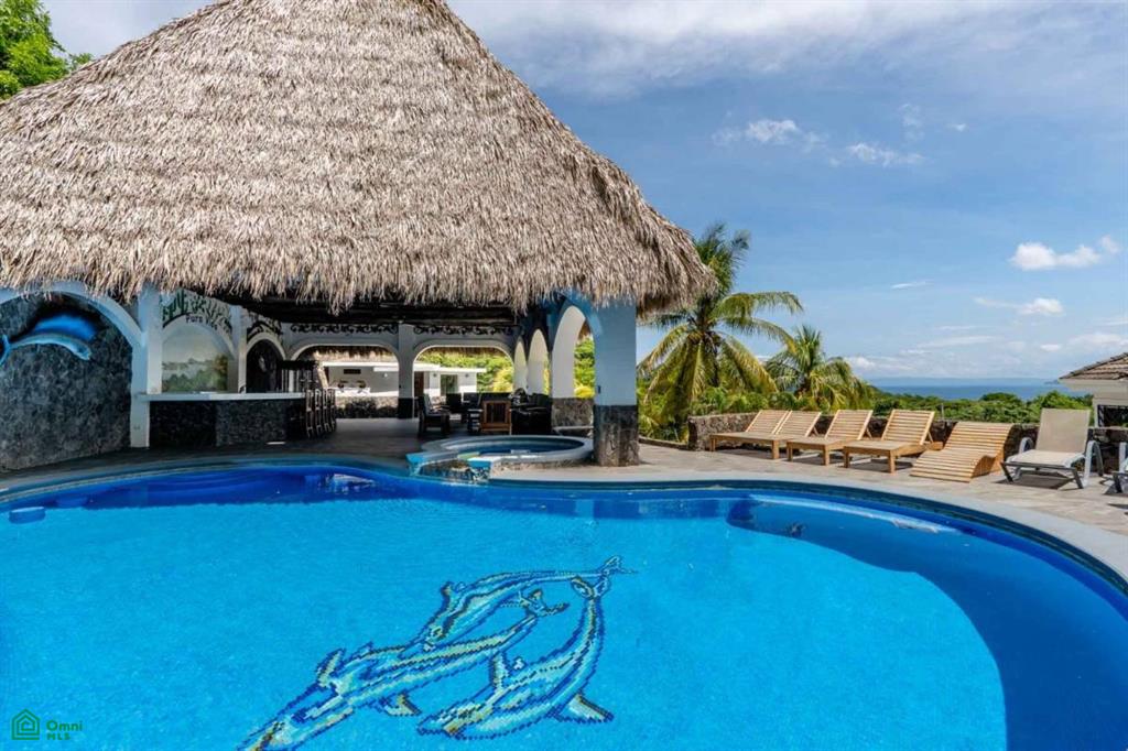 The property’s best feature is the impressive, open-air pavilion. Situated on the highest tier of the estate, this grand structure features a beautiful thatched roof and is a complete entertainment hub. It includes a full-service bar, a kitchen, a bathroom, and multiple zones for lounging, recreation, and fitness. The pavilion overlooks a large swimming pool, a heated jacuzzi, and a sun-drenched deck—all offering ocean views. The lower level of the villa provides a two-car garage with a large, secure storage room. It also houses a fully independent guest suite with its own kitchen, dining area, bedroom, and bathroom. Adjacent to this apartment is an additional bedroom with a private ensuite. Crafted for large gatherings, Villa Perfecta Vida is perfectly suited for family and friends seeking to enjoy Costa Rica’s idyllic climate. The professionally landscaped, terraced gardens provide a tranquil and secluded atmosphere. With over 8,700 square feet of total living space, including the 3,490-square-foot outdoor terraces and pavilion, this home provides immense scale.
