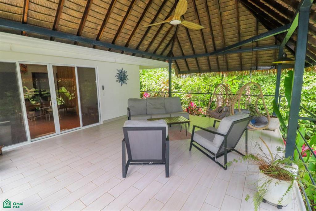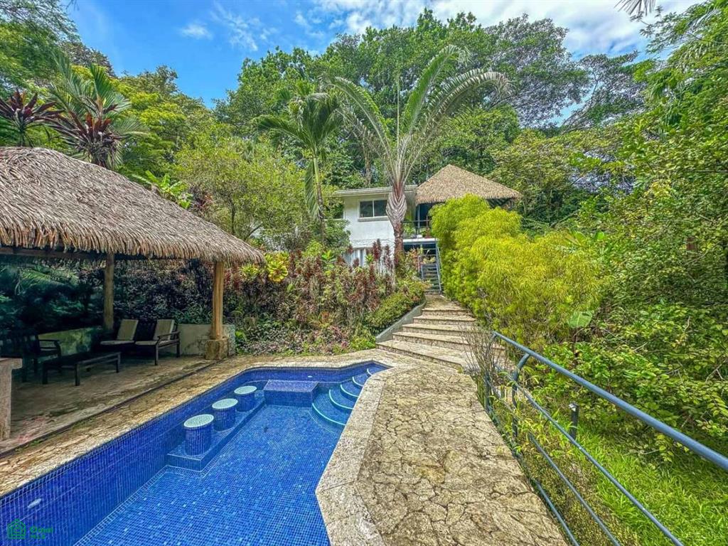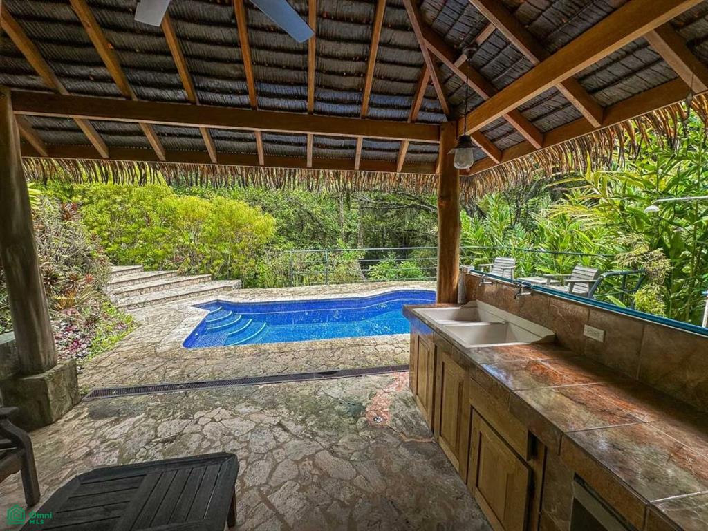 Be the master of your own tropical rainforest domain – after parking in the covered carport you cross a beautiful arching footbridge, bordered by tropical lushness, to enter your elevated jungle-clad home. The large covered deck, attached to the side of this house, offers a panoramic view over your kingdom – sprawling jungles, mountain creek, a sunny pool, poolside cabana, and two beautiful & modern casitas which have no trouble generating plenty of income.
