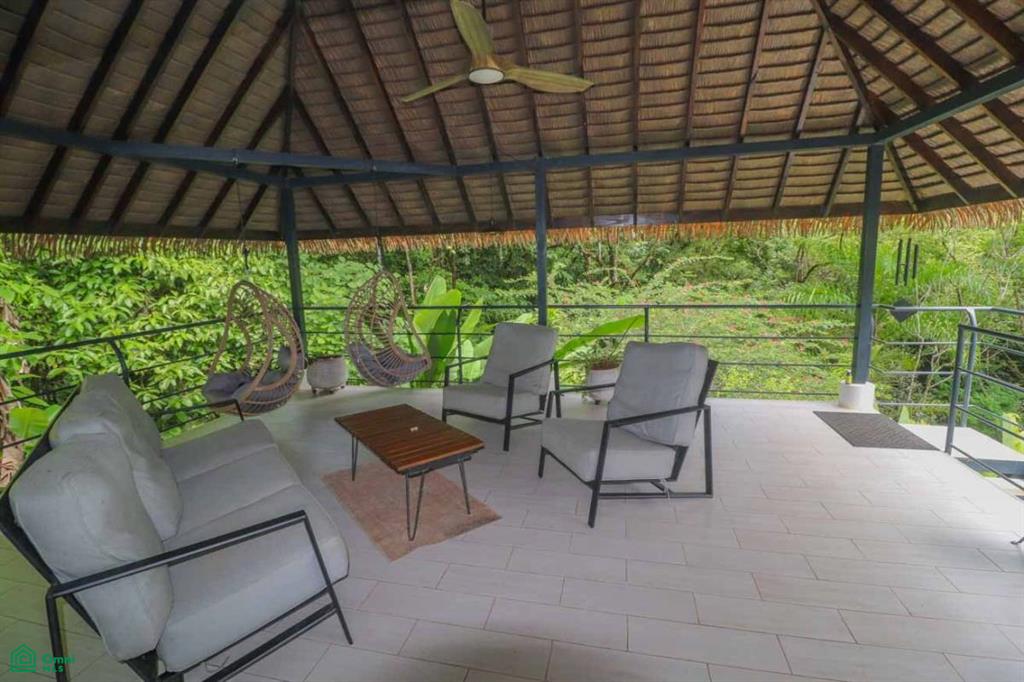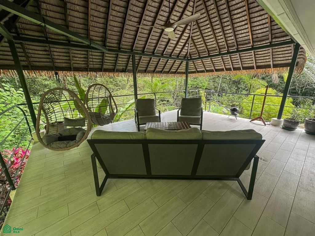 Crossing the arching footbridge, you are met with a covered verandah which runs the length of the main house – straddling the back section of the home, this verandah leads straight to the opposite end with a huge thatched-roof patio decked out with a ceiling fan, coffee table, plentiful seating and two suspended deckchairs. Green, natural views extend in every direction. The main home features modern finishes, spacious living areas, and an open layout that flows seamlessly into the natural surroundings.