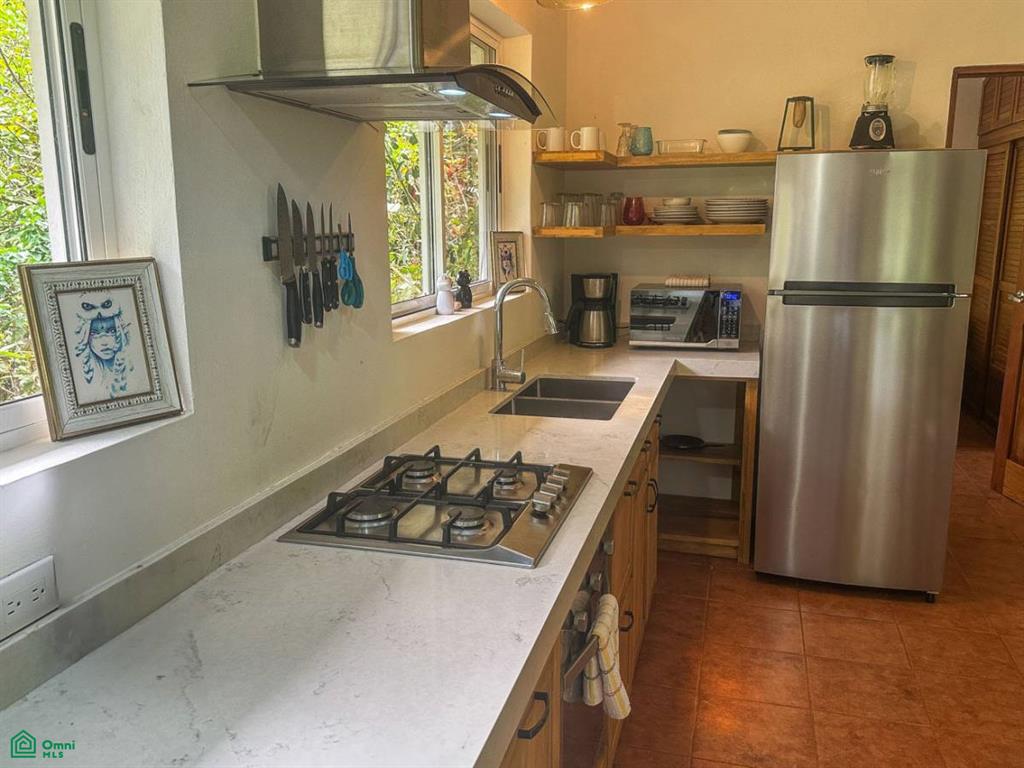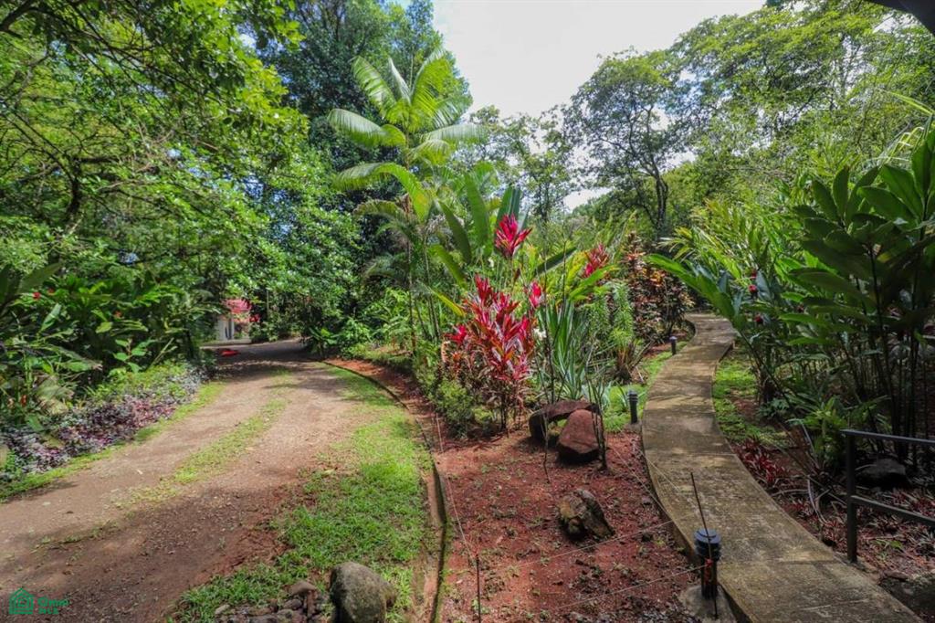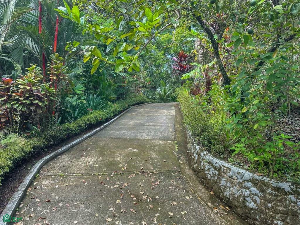 A secure electric gate welcomes you to the property as the winding driveway, bordered by landscaped gardens and exotic greenery, descends & meanders her way to the main house – setting the tone of TOTAL tranquility. The covered carport will keep you & your vehicle dry and shaded. And the entrance is quite grande - a beautiful, arching footbridge connects the carport to the main home. The home sits about 1.4km away from the Costanera highway. A prepared road leads over Ojochal’s new bridge and past some of the town’s finest restaurants & attractions as it twists towards the home.