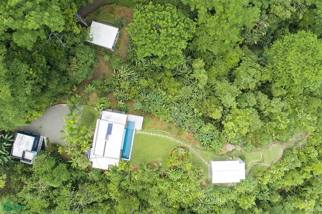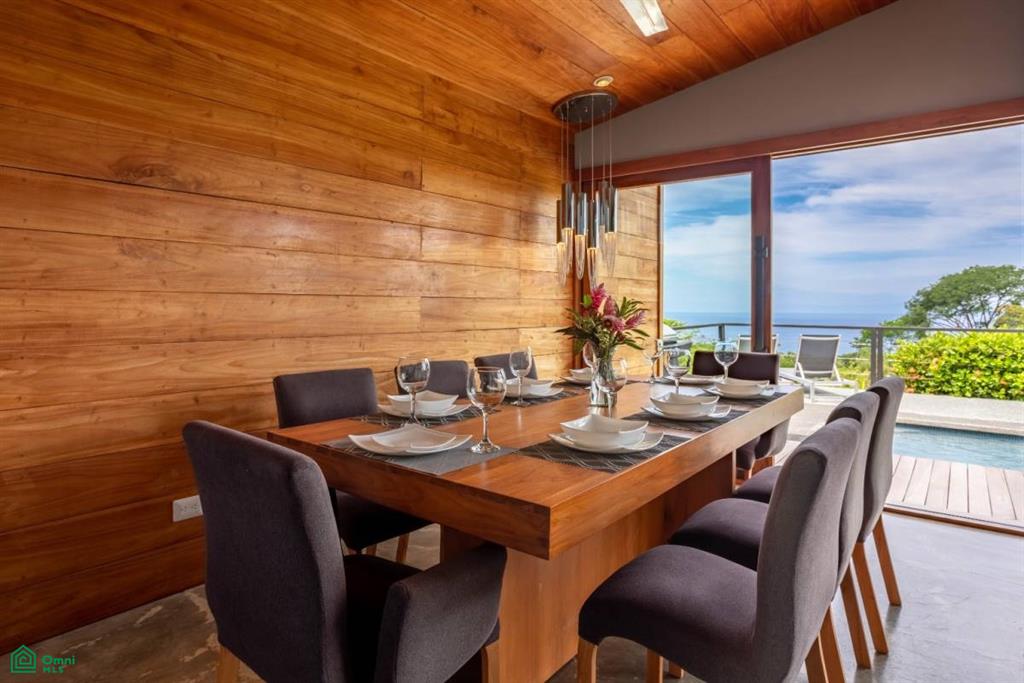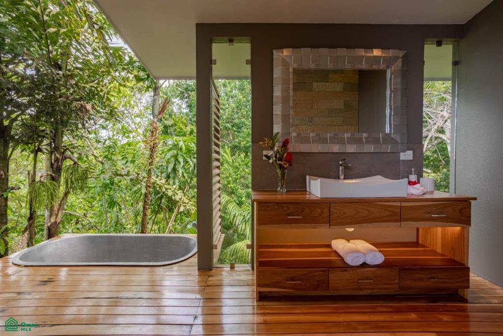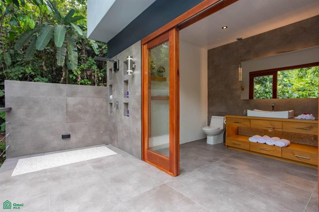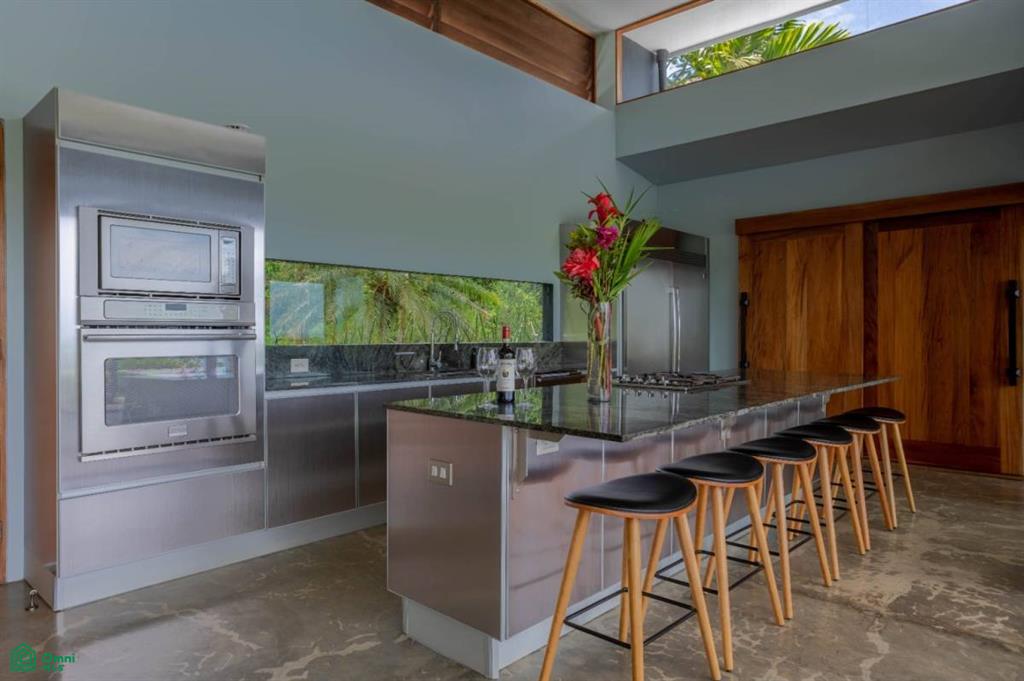 The main residence, positioned on the north end, unveils two-bedroom suites with an open bathroom plan, enveloped by mature Ylang-Ylang trees and the seclusion of the jungle. Gleaming, polished concrete floors guide you through an open floor plan, leading to a gourmet kitchen with stainless steel appliances. The private dining room seamlessly merges with the sunset, offering an ideal space for entertaining.
