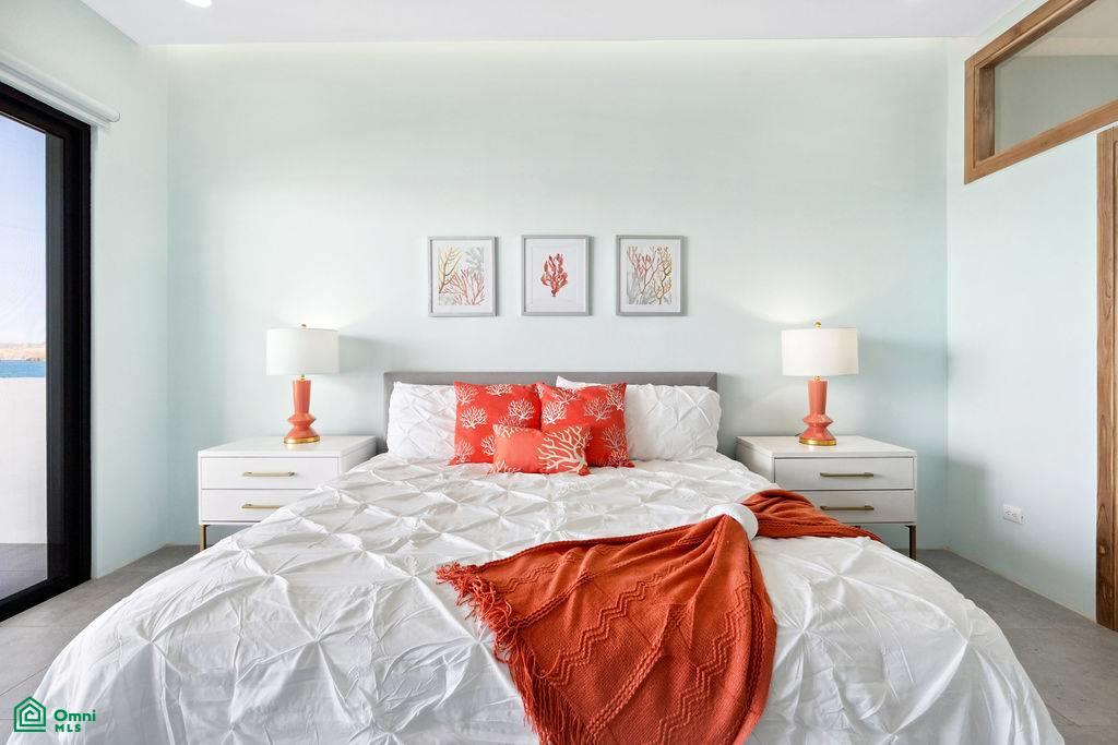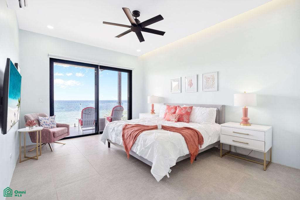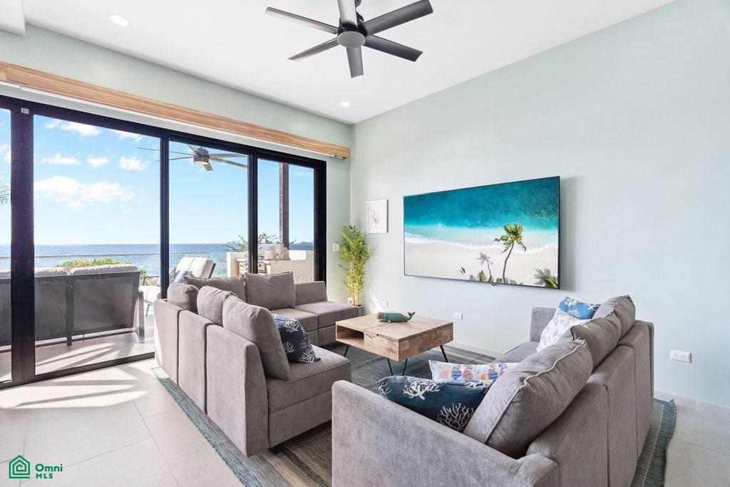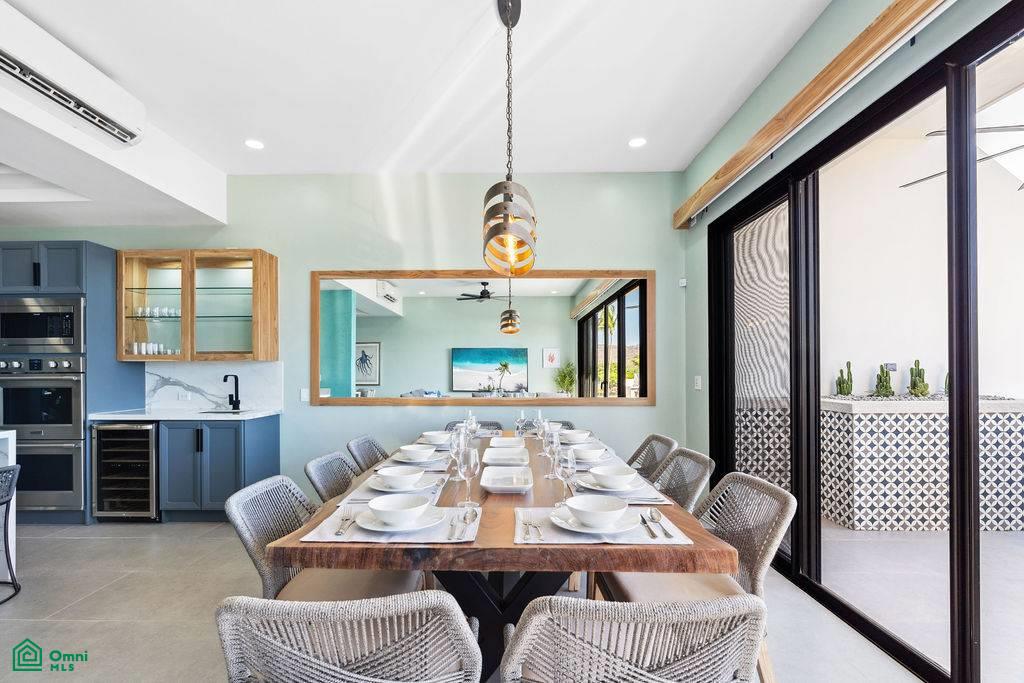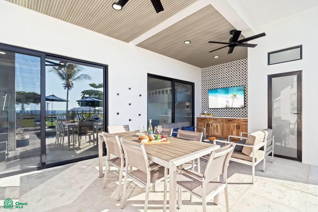 This lovely space is surrounded by tropical plants, an outdoor shower as you come in from the beach side, and a raised paver platform underneath a beautiful almond tree to relax in the shade and to witness some of the most amazing sunsets Mother Nature can offer. While the fun is happening downstairs, the more refined entertaining area is on the second level, which serves as the heart of the home and has simply jaw- dropping ocean views from every