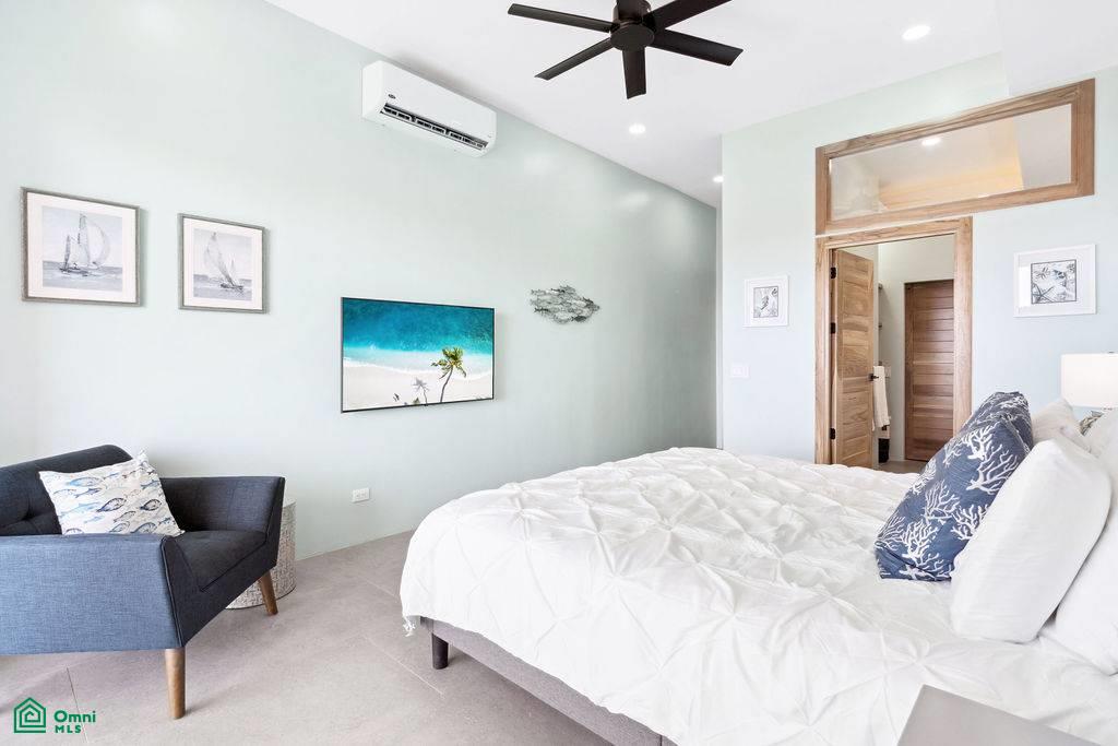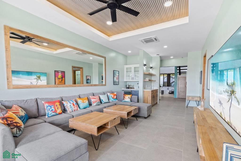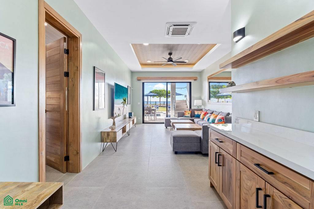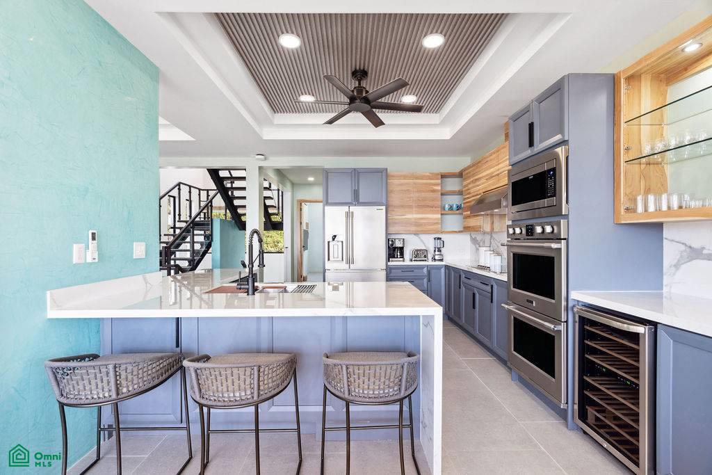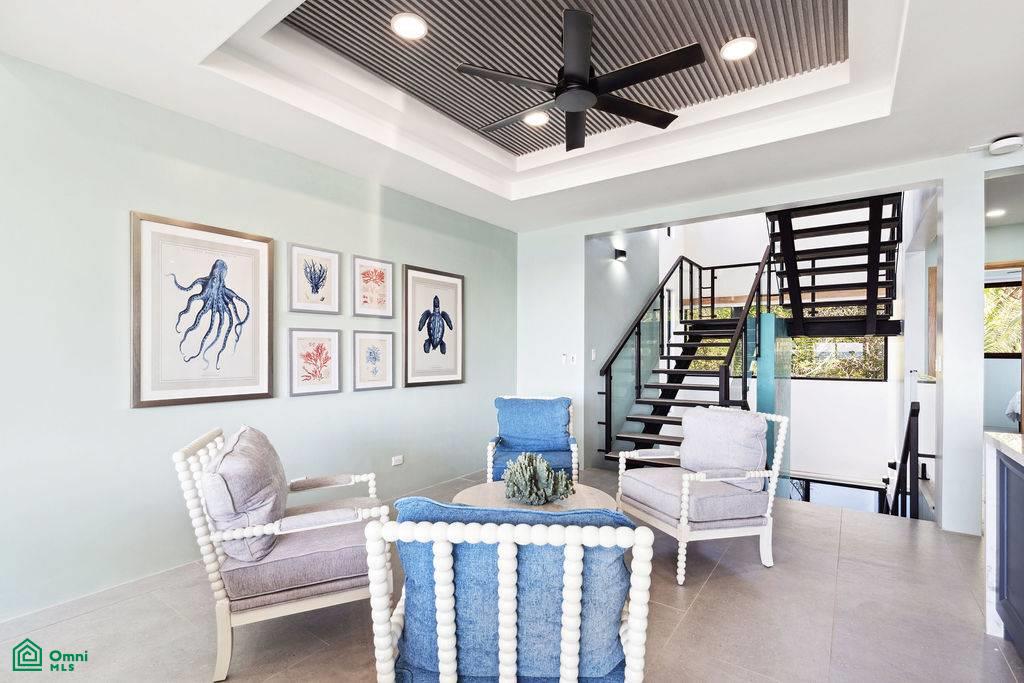 Upon entering the home, you are immediately met with an architecturally significant foyer, flooded with natural light and featuring a striking accent wall made from Venetian Stucco. This foyer is crowned with a large ceiling fan hanging from a teak-wood accent panel with back-lighting for the ultimate in first impressions.
