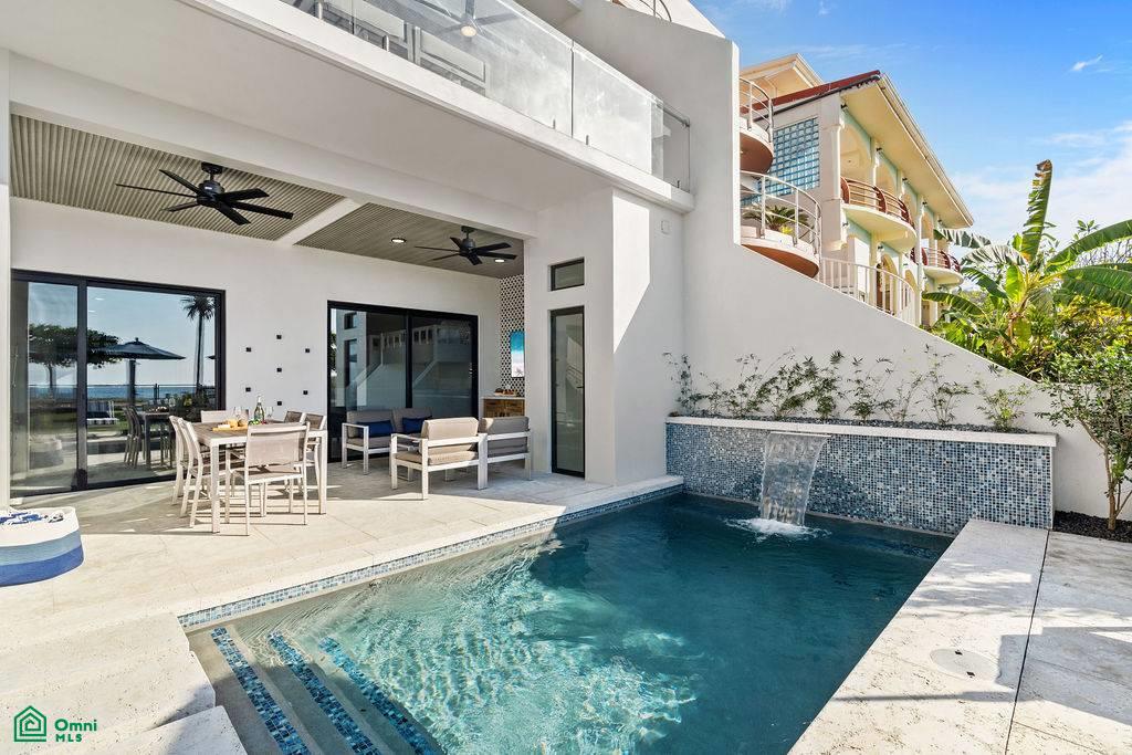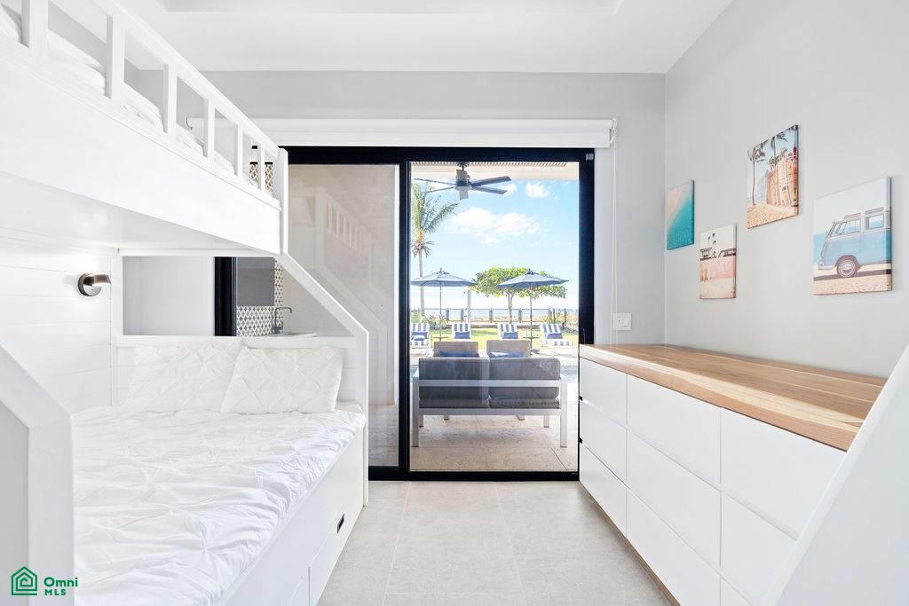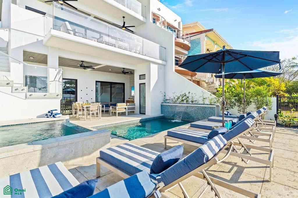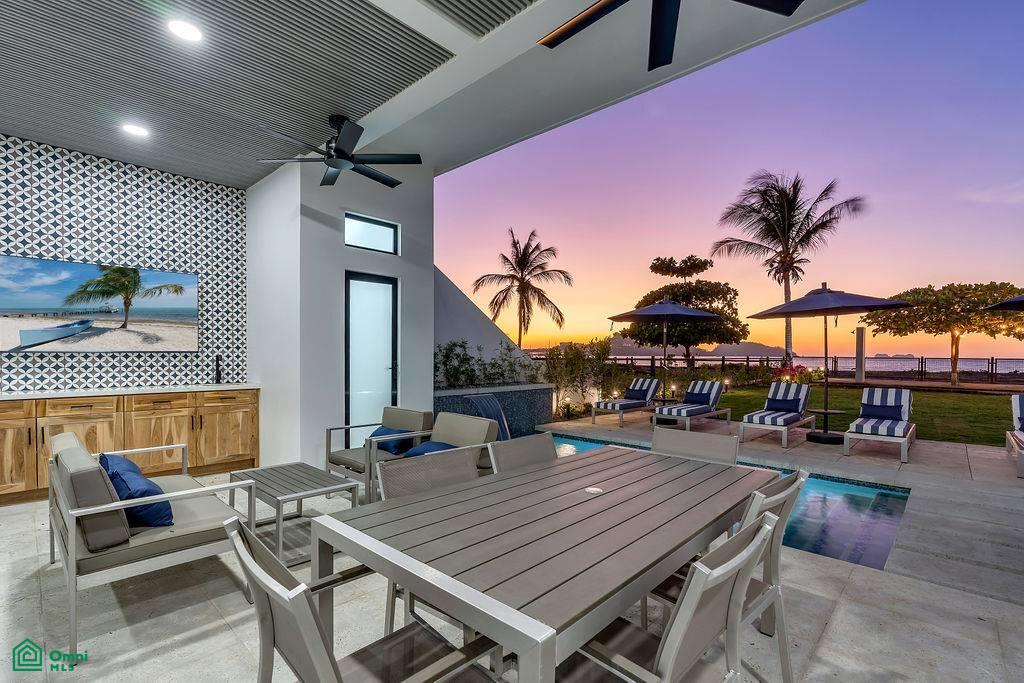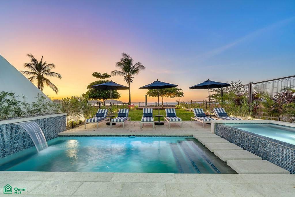 This family family space opens via sliding glass doors that lead to a large covered patio, complete with an outdoor wet bar with quartz countertops, blond teak cabinets and a second flat-screen TV; the stunning pool with two water features, a separate jacuzzi tub for eight, a pool 1/2 bathroom; seating areas in both sun and shade, and floating steps that lead to the resort-style poolside lounge chairs with umbrellas.