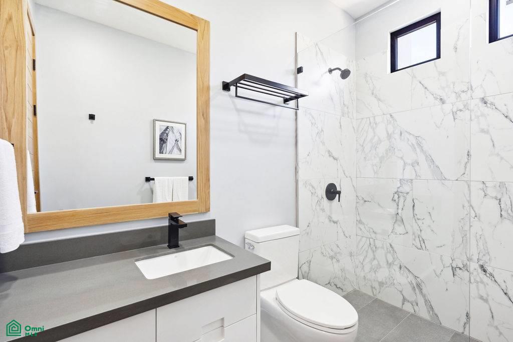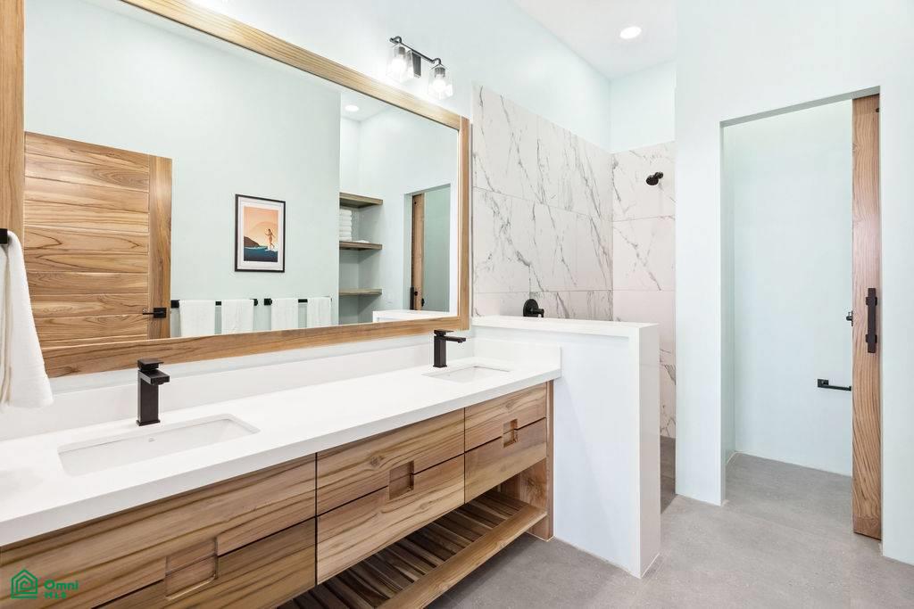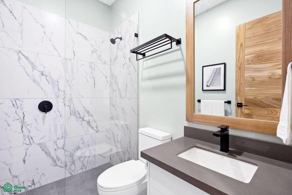 Just off this first floor family room is an epic bunkbed room for young kids and teenagers alike. This space sleeps eight, features single-over-queen sized bunk beds (each with their own reading lights, charging stations, and built-in storage), and has a fun en-suite bathroom with two showers and a three-sink vanity.