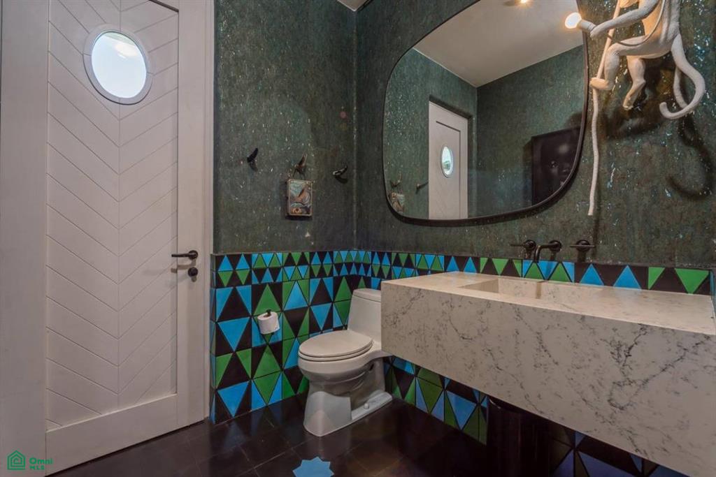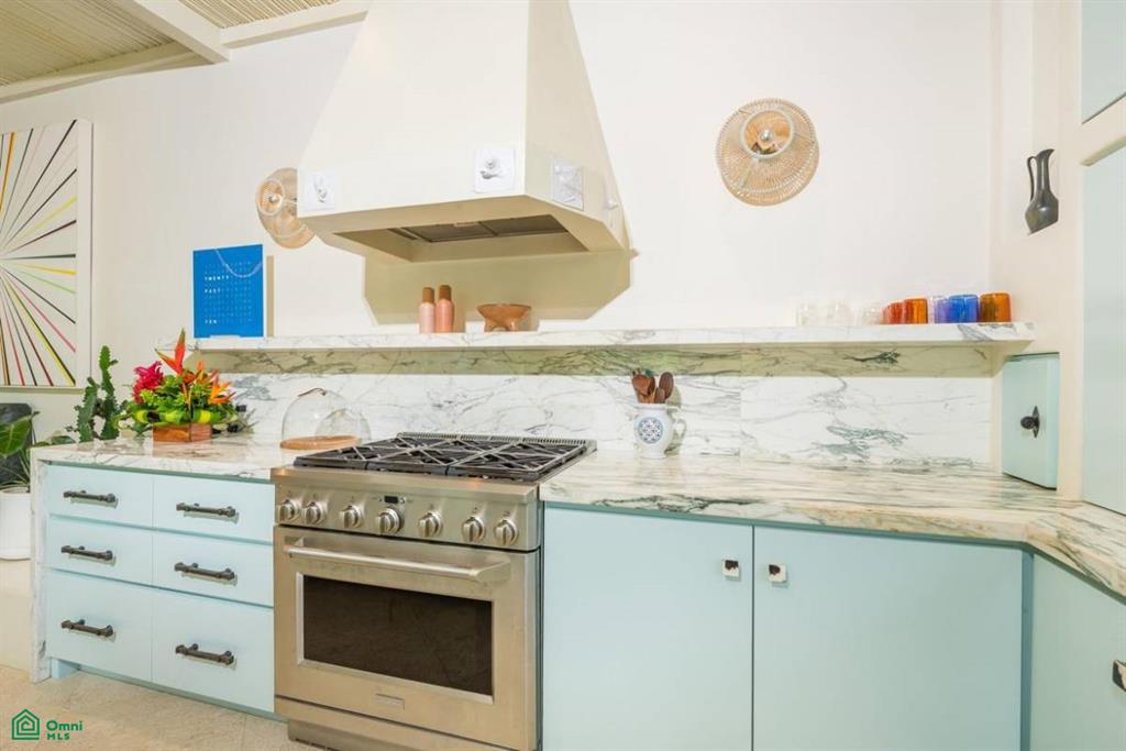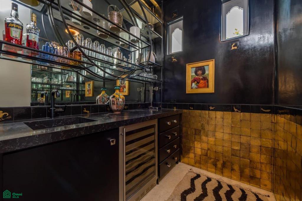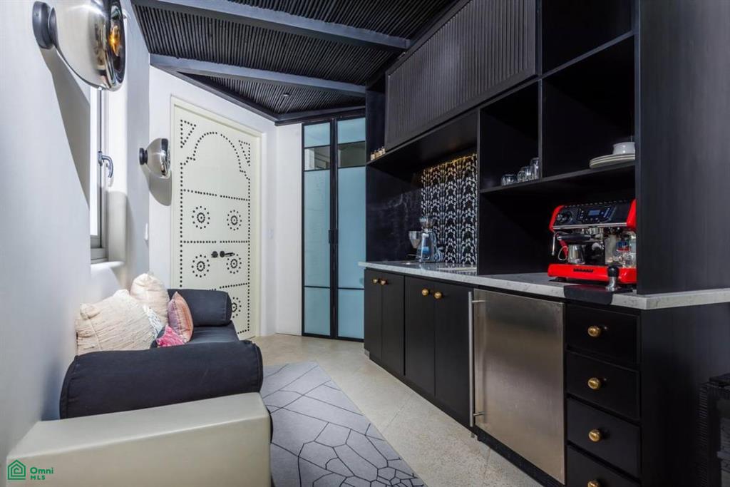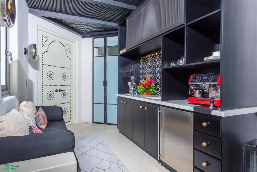 The expansive kitchen and dining room, with patio doors opening to a terrace, is a culinary enthusiast's dream. An oversized stone island with concrete details, handmade tiles on the hood above the gas range, and an abundance of counter space make this a perfect space for creating culinary masterpieces. The living room is a sanctuary of comfort, boasting super-soft carpets and an arched sitting area with views. A gorgeous bar, just off the living room, adorned with tiles from Belgium and Paris, adds a touch of European charm to your e