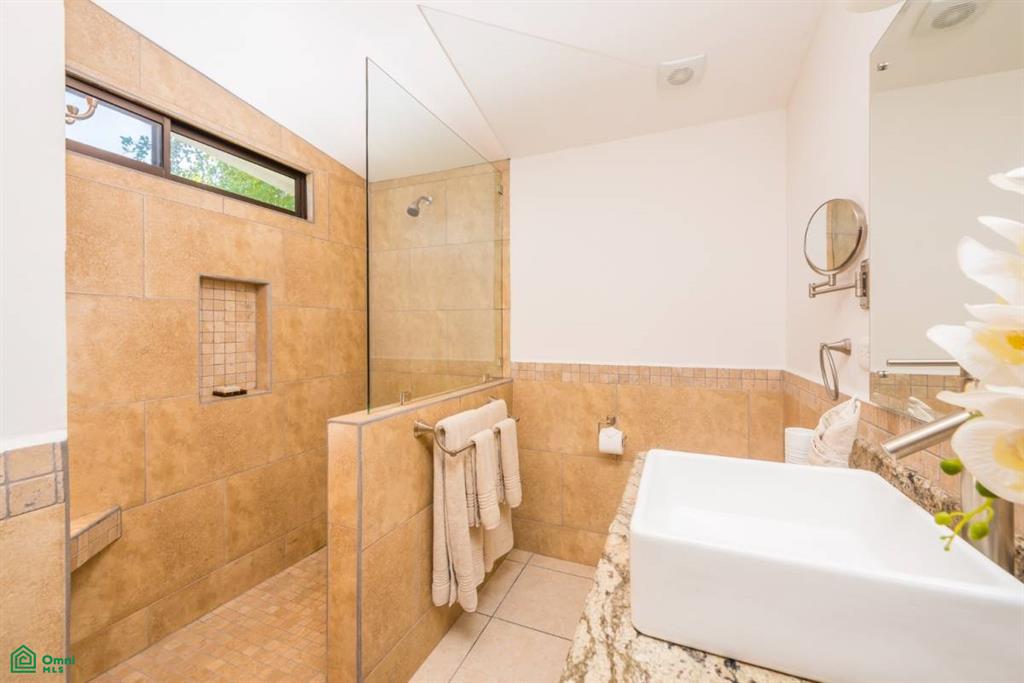 Step outside and into the private pool and jacuzzi where outdoor entertaining has never been easier. Waterfalls cascade from the jacuzzi into the pool below and one entire rock wall is a waterfall into the pool. Adjacent to the pool is a lounging area and outdoor kitchen with a built-in Weber grill.