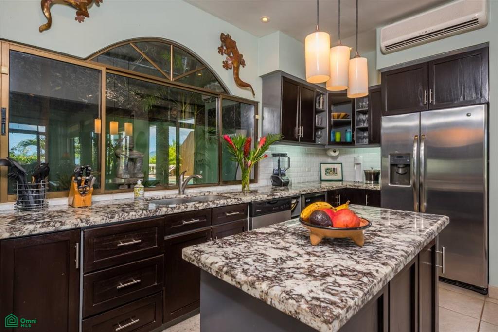 The main living area includes the living room, dining room and spacious kitchen, all while incorporating those gorgeous ocean views. With beautiful granite countertops, plenty of storage and stainless appliances including a wine fridge, this kitchen will make the cook feel right at home and still a part of the gathering. With sliding glass doors opening onto the veranda, outdoor living spaces, and pool, this comfortable living room takes advantage of the endless ocean views.