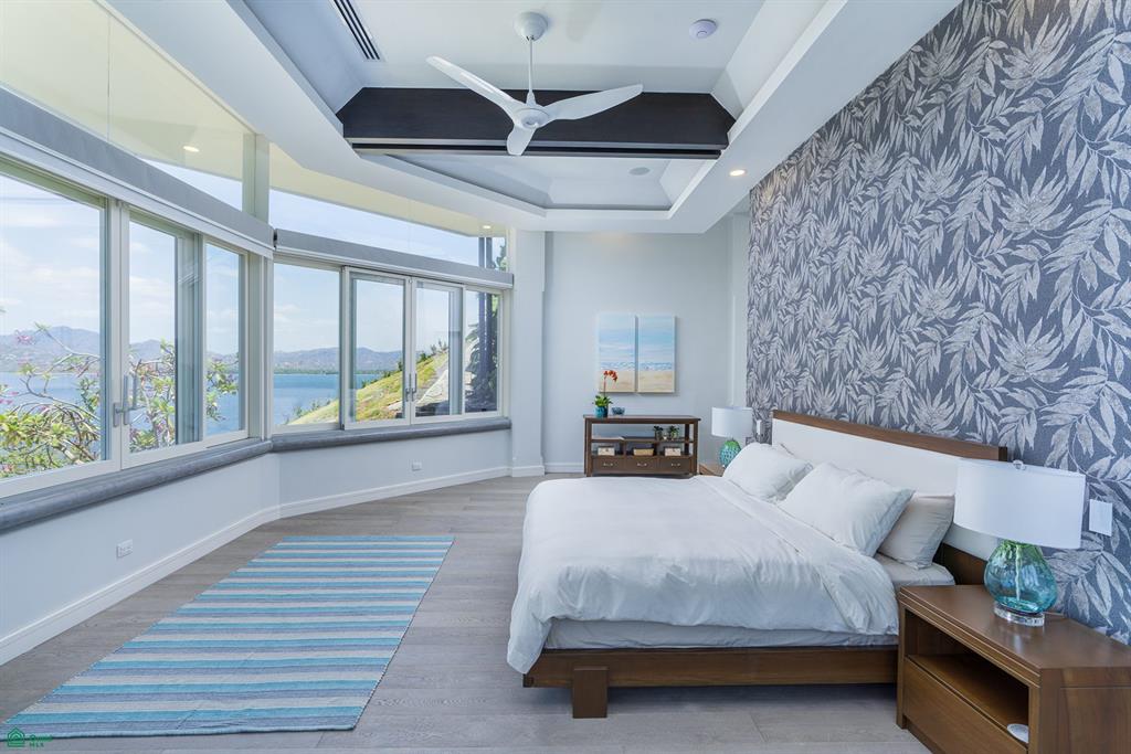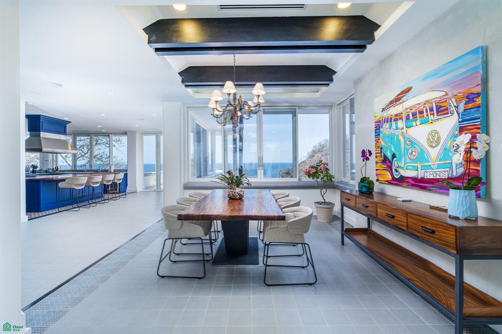 Spanning just under 10,000 square feet of refined living space, the home has been meticulously designed to blend timeless elegance with modern luxury. The main residence offers six expansive bedrooms, six full bathrooms, a guest half-bath, and a dedicated playroom, complemented by a separate caretaker’s apartment that provides privacy and on-site convenience. Every interior space is thoughtfully oriented to capture ocean views, cooling breezes, and the ever-changing coastal scenery.