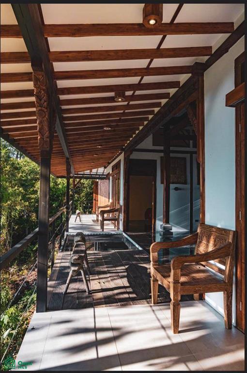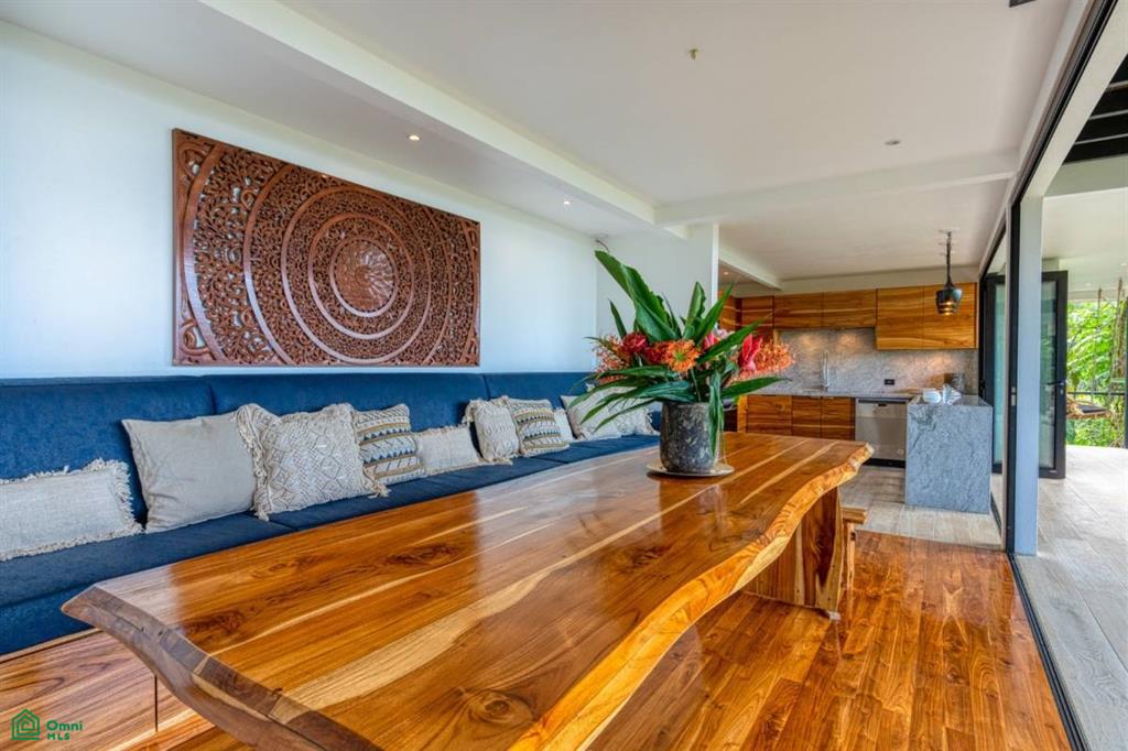 The property welcomes you with a parking area for up to three vehicles. A series of stairs leads to the main level, where open-concept living spaces create the perfect setting for relaxation and entertaining. Upon entering through a custom Bali-crafted wooden door, you’re greeted by a beautifully carved ceiling and a bright, airy hallway. The living room showcases panoramic ocean views and features a unique hanging net lounge positioned directly toward the Whale Tail, an inviting space to unwind. A convenient countertop nearby serves as an ideal tea or snack station.