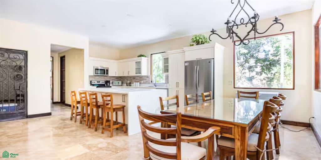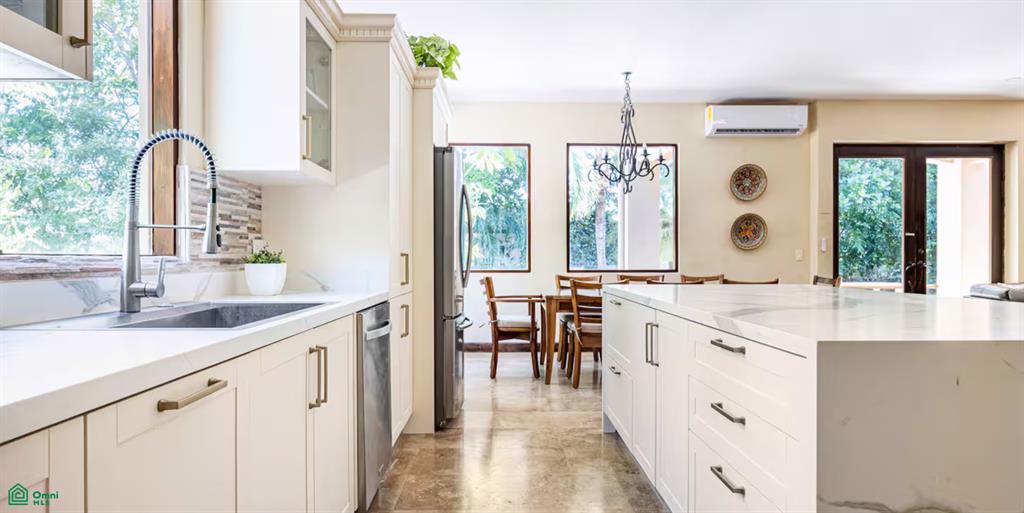 The kitchen features a central island that functions as a breakfast bar and preparation space. Expansive social salons open directly to the terrace and pool area, allowing entertaining to unfold naturally between interior and exterior environments. The 0.53-acre homesite provides proportion and breathing room, reinforcing the sense of a private sanctuary within a larger resort community.