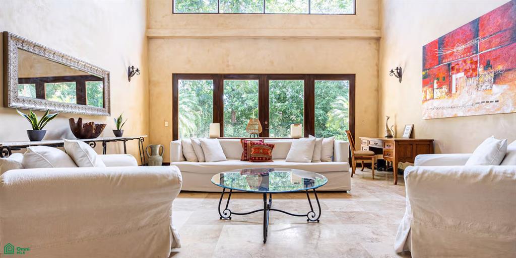 The architecture centers on volume, light, and seamless indoor-outdoor integration. Travertine marble floors extend beneath high ceilings, guiding the eye through walls of glass toward the infinity-edge pool that anchors the social areas. The pool reflects the sky and surrounding greenery, creating a visual focal point that connects the residence to its tropical setting. Manicured gardens and sun decks frame the home, offering both privacy and a living backdrop of native landscape.